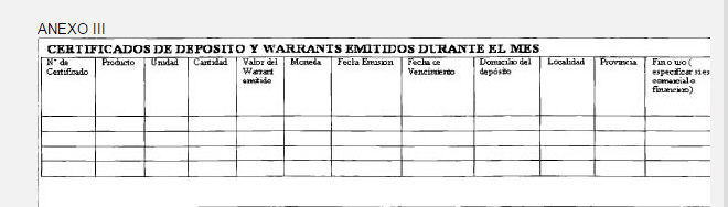 Que por el presente acto administrativo corresponde incorporar como Anexo III la información relativa a los certificados de depósito y warrants expedidos con fines comerciales y aquellos que sean emitidos con carácter financiero a través del endoso correspondiente.