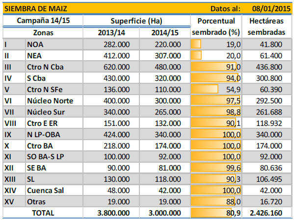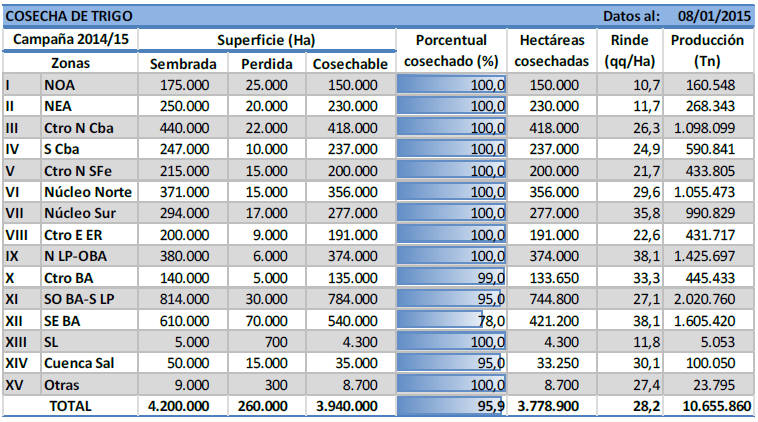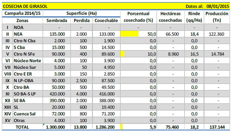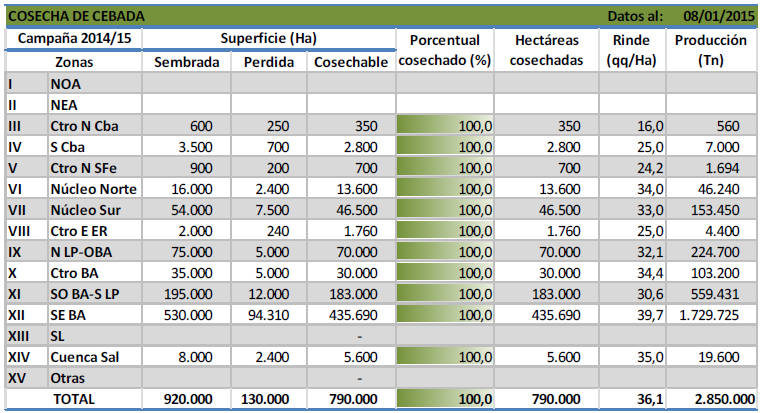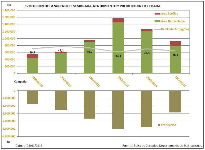 En números absolutos se recolectaron 790 mHa a nivel nacional, entregando un rinde medio de 36,1 qq/Ha. De este modo, la producción total asciende a las 2.850.000 toneladas. Esta producción consolida una caída de 950 mTn en comparación a la campaña 2013-14. Las principales variables que explican esta disminución productiva son la caída de -28 % en el área sembrada, las pérdidas de superficie que triplicaron las registradas durante el ciclo previo, y un rinde promedio nacional 8,4 % inferior al de la campaña pasada.