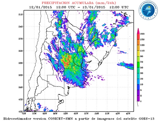 Al ingresar en la página del Servicio Meteorológico Nacional -y al ingresar en el “Centro de Meteorología por Sensores Remotos” y buscar las “Imágenes satelitales” “Hidroestimador”- podremos observar los acumulados de las últimas 24 horas.