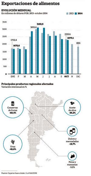 La pérdida de competitividad de la industria argentina de alimentos y bebidas ya se siente en la balanza comercial del país. En el sector, informaron que en octubre pasado las exportaciones del rubro sufrieron la cuarta caída consecutiva en dólares, con una baja interanual de 2,1%, y alertaron que el impacto se ve con especial fuerza entre las economías regionales, que en los primeros diez meses de 2014 acumularon una baja de 11,9% en sus ingresos.