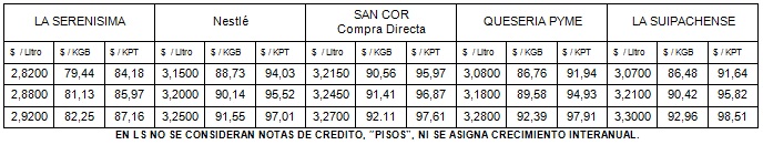 En la Cuenca Oeste de Bs. As., para una leche libre de Brucelosis y Tuberculosis, con 3.55% grasa y 3.35% proteína, que tiene 25.000 UFC, 300.000 CCS, y es remitida a 4.0 ºC. Se trata de una estimación genérica y -como tal- sólo orientativa, referida a algunas de las principales empresas que operan comercialmente en la Región. IMPORTANTE: Se trata de valores estándar “de circular” en “anillo 2” para La Serenísima (no incluye notas de crédito), pero de precios “llenos” para el resto de las empresas. La 1º fila, se refiere a un tambo de 1400 litros / día, la 2° corresponde a un tambo de 4000 litros / día, y la 3º hace referencia a un tambo de 8000 litros / día.