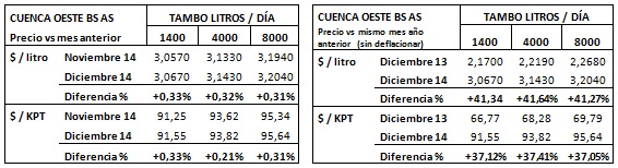 En la Cuenca Oeste de Buenos Aires, en Diciembre se percibieron por la leche remitida, los mismos precios que en Noviembre, por parte de las principales empresas que operan en la región. E incluso se logró alguna pequeña mejora en el área de pymes vinculadas al circuito de la mozzarella (que era un sector industrial que venía "corriendo de atrás", y por esos días tonificó su demanda, ya que el stock que había logrado formar hasta ese momento, para atender las necesidades de la temporada estival, resultaba algo insuficiente).