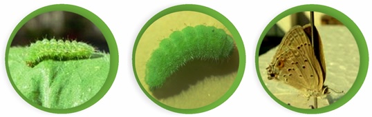 Descripción: Las orugas son pequeñas (1 a 2 cm.) y poseen una cabeza retráctil. El cuerpo está revestido de abundantes pelos, finos y cortos. En general, en las especies pertenecientes a esta familia, las larvas de primeros estadios se alimentan de hojas, botones florales, brotes, vainas o frutos. Los últimos estadios comen introduciendo su cabeza y tórax dentro de la estructura vegetal, de modo que solo la parte posterior queda visible. Si bien se pueden alimentar de una amplia variedad de plantas, las fabáceas son sus favoritas. El cuerpo es comprimido, ligeramente aguzado en sus extremos con abundantes setas secundarias que le confieren una textura aterciopelada. Cuando se deslizan la cabeza y las patas permanecen ocultas. Muy pocos Lycaenidae son plagas de importancia económica porque sus densidades poblacionales son bajas (Stehr, 1987).