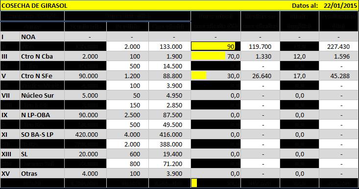 La región Centro-Norte de Córdoba presenta importantes avances en la trilla. En líneas generales, la zona presenta una escasa superficie sembrada con esta oleaginosa, y los materiales empleados son en su mayoría de tipo confitero. Hacia el Sur de Córdoba el cultivo se encuentra iniciando el llenado de grano, en muy buenas condiciones, y se han hecho aplicaciones para el control de oruga medidora. Este mismo control se ha realizado en la región Norte de La Pampa-Oeste de Buenos Aires, en la cual el cultivo transita llenado de granos y en donde se espera que, avanzado el mes de febrero, se cosechen rendimientos levemente por encima de los promedios históricos.