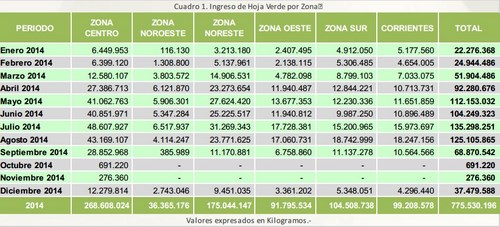El ingreso de materia prima a los establecimientos de secanza permite observar el avance de cosecha en la región productora. Los datos correspondientes a las declaraciones juradas presentadas por los operadores ante el Instituto Nacional de la Yerba Mate (INYM) indican que entre los meses de Enero y Diciembre fueron procesados 775.530.196 Kilogramos de hoja verde.