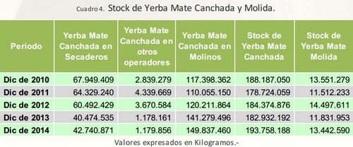 En tal sentido, el stock de yerba mate canchada en secaderos al mes de Diciembre de 2014 ascendió a 42.740.871 Kilogramos, mientras que los molinos contaban con un stock de 149.837.460 kilogramos y el stock en poder de otros operadores fue de 1.179.856 Kilogramos. Por otra parte, en cuanto a la yerba molida, al mes de Diciembre de 2014 la industria mantuvo un stock de 13.442.590 kilogramos.