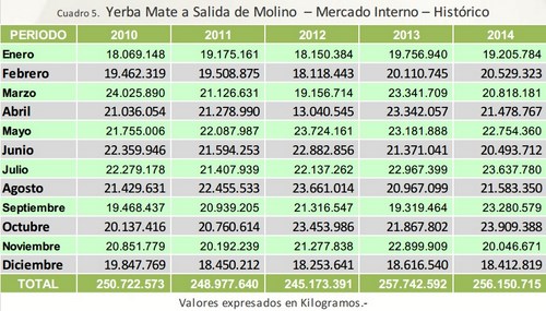 Los datos estadísticos registrados por el Instituto Nacional de la Yerba Mate (INYM) revelan que durante el mes de Diciembre de 2014 el volumen de yerba mate elaborada a salida de molino alcanzó los 18.412.819 Kilogramos. Sumado a los meses anteriores las salidas con destino al mercado interno totalizan 256.150.715 Kilogramos para el período Enero-Diciembre de 2014.