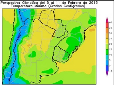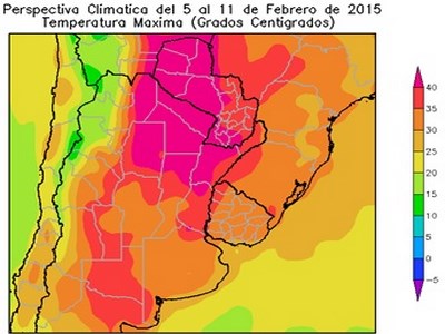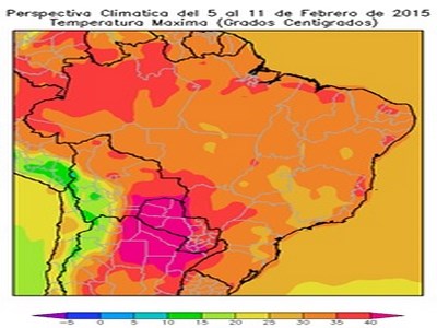 Un amplio foco cálido con temperaturas máximas superiores a 35ºC se ubicará sobre el centro del área agrícola. El Paraguay, la Región del Chaco, el este del NOA, el norte de Santa Fe, la mayor parte de Corrientes y el norte de Entre Ríos registrarán temperaturas máximas superiores a 40ºC. El centro del NOA, el centro-este de Cuyo, la mayor parte de la Región Pampeana y la mayor parte de la República Oriental del Uruguay, observarán temperaturas máximas entre 30 y 35ºC.