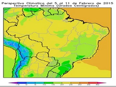 Paralelamente, los vientos rotarán al sector sur moderando temporalmente la temperatura, provocando un marcado descenso térmico en las zonas altas de Santa Catarina y Paraná. El norte y la mayor parte del oeste del área agrícola brasileña observará temperaturas mínimas superiores a 20°C. El sur de los Estados de: Pará, Tocantins, Piauí, el sur de Mato Grosso do Sul, el norte y el sur de Mato Grosso, el este y el oeste de Santa Catarina, el oeste de Río Grande do Sul y la mayor parte de los Estados de de Goias, Bahía, Mina Gerais, Sao Paulo y Paraná, registrarán temperaturas mínimas entre 15 y 20ºC.