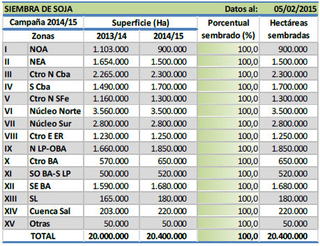 Luego de incorporar los últimos cuadros en las regiones NOA, NEA y Centro-Norte de Santa Fe, al presente informe se da por finalizada la siembra nacional y la estimación de área destinada a esta oleaginosa se mantiene en 20.400.000 hectáreas para la campaña en curso.