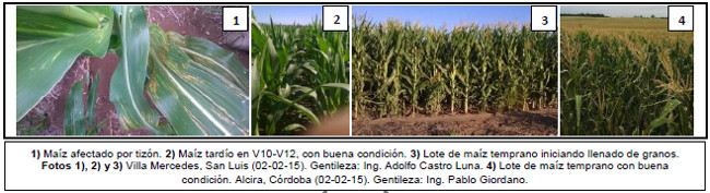 En la zona núcleo maicera (Norte y Sur) las condiciones de los cuadros de siembras tempranas son buenas en un 50 % de los casos, muy buenas en un 20 % y excelentes en un 30 %; mientras transitan estadíos desde grano duro (R5) a madurez fisiológica. De esta manera, se espera obtener productividades que se ubiquen por encima de los promedios históricos regionales. A nivel sanitario, se reporta presencia de pústulas de roya y tizón. A esto debe sumarse la presencia de poblaciones de gusano cogollero, el cual ha sido controlado por medio de aplicaciones de fitosanitarios. Por su parte, el grueso de los cuadros de siembras tardías y de segunda ocupación se encuentra culminando las etapas vegetativas en óptimas condiciones hídricas y sanitarias.
