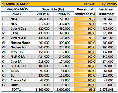 Por último, la zona de la Cuenca del Salado también espera obtener muy buenos rendimientos, dado que el maíz de primera ha tenido buenas condiciones hídricas durante su ciclo. Hoy las expectativas a cosecha presentan un rango de 80 a 100 qq/Ha. Al igual que en gran parte de las zonas agrícolas, se hicieron presentes enfermedades tales como roya y tizón, las cuales están siendo controladas.