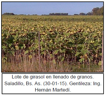 Por último para la región Sudeste de Buenos Aires el estadío de desarrollo logrado es dispar, y se encuentran girasoles desde floración, sembrados de forma tardía, hasta lotes alcanzando la madurez fisiológica en la zona costera. Al igual que la vecina región, un frente de tormenta ha descargado agua sobre esta zona, principalmente hacia el oeste de la misma y, según pronósticos climáticos, se espera que durante estos días ocurran nuevos eventos de precipitaciones. En líneas generales se habla de un cultivo que presenta buenas condiciones y la trilla iniciaría hacia fin de febrero.