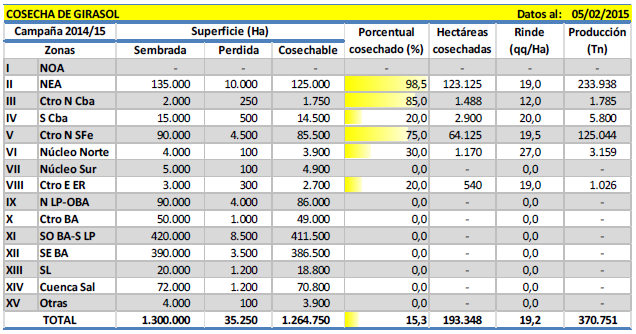 El NEA ha cosechado el 98,5 % de los cuadros, de los cuales se calcula un rinde promedio de 19 qq/Ha. Si bien se registraron nuevos eventos de precipitaciones sobre la región Centro-Norte de Santa Fe, durante los últimos siete días han ocurrido importantes progresos en la cosecha girasolera regional. De esta forma, el avance de trilla cubre el 75 % de la superficie apta y el rendimiento calculado asciende a 19,5 qq/Ha.