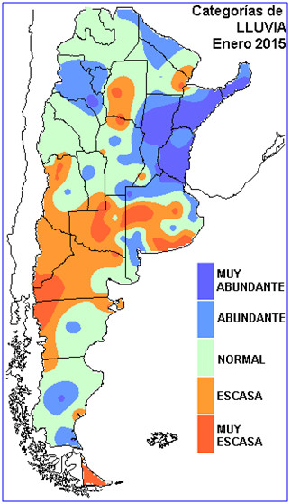 Las lluvias categorizadas por su comparación con los valores estadísticos, evidencian la normalización del patrón pluvial del mes de enero y salvando las zonas no agrícolas que se ubican sobre el este chaqueño, las lluvias aumentan notoriamente hacia la Mesopotamia, habiéndose concretado máximos pluviales de suma importancia en la provincia de Corrientes, territorio que por otra parte ya arrastraba una sobreoferta de lluvias muy destacada desde diciembre.