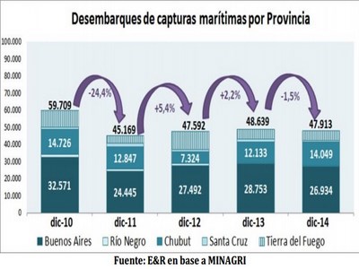 En el mes de Diciembre de 2014, se presentaron caídas de los desembarques en Buenos Aires (-6,3%), debido principalmente al puerto de Mar del Plata, que disminuyó los desembarques en 1.884 toneladas, en Río Negro (-23,4%) donde los desembarques en los puertos de San Antonio Este cayeron en 138 toneladas y en Santa Cruz (-64,8%), pudiendo mencionarse que en Puerto Deseado los desembarques cayeron en 546 toneladas. En sentido contrario se presentan subas interanuales Chubut (+15,8%) donde en Puerto Madryn se desembarcaron 2.858 toneladas más que en igual mes de 2013 y Tierra del Fuego (+8%) donde desembarcaron 437 toneladas más en Ushuaia que en Diciembre de 2013.