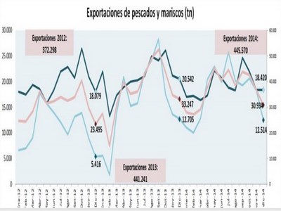 En Diciembre de 2014, a partir de los datos de SENASA, que incluyen únicamente los volúmenes fiscalizados por la Dirección Nacional de Protección Vegetal y la Dirección de Tráfico Internacional, las exportaciones de pescados más mariscos (crustáceos y moluscos) alcanzaron las 30.934 toneladas, registrando una caída del 7% si se la compara contra Diciembre de 2013.