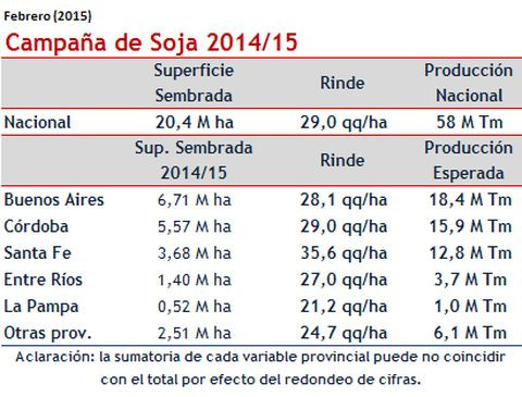 A diferencia del informe de enero en el que se trabajó con proyecciones en base a comportamientos históricos, ya es posible efectuar una estimación de rendimientos. Las condiciones bajo las cuales empezaron a definirse los rindes permiten estimar el rinde promedio en 29 quintales por hectárea a escala nacional. Sobre la base de una superficie no cosechable de 440.000 hectáreas, la producción de soja que podría obtenerse en la nueva temporada sería de 58 millones de toneladas.