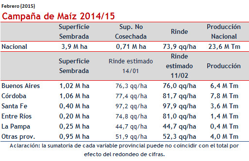 El ajuste al alza en la estimación es del 5% respecto del guarismo anterior (22,4 millones de toneladas), lo que deja la campaña maicera 2014/15 con 23,6 millones de toneladas de producción. Este rinde nacional se ha estimado en 73,9 qq/ha, cuando la estimación previa era de 73,5 quintales. El número de producción se compone, por ende, de esa cifra de productividad unitaria y unas 707.000 hectáreas que no entrarían a circuito comercial. El detalle puede verse en la tabla que sigue, tomándose para Entre Ríos los números de SIBER, de la Bolsa de Cereales de Entre Ríos.