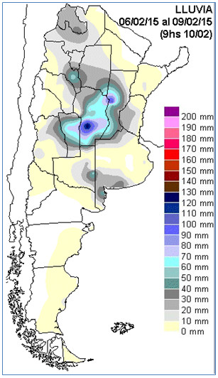 En el mapa se representan las lluvias hasta las 9 hs del martes. En él se observa la muy buena performance de las lluvias en CB y SF, con una franja que toma áreas del oeste de ER y el norte de BA donde los registros orillan o superan los 30 milímetros. Este último sector se vio favorecido casi en forma marginal por las lluvias que tuvieron epicentro en CB, donde se registraron los máximos pluviales del período. Desde allí la oferta de agua fue disminuyendo hacia el sur y hacia el este.