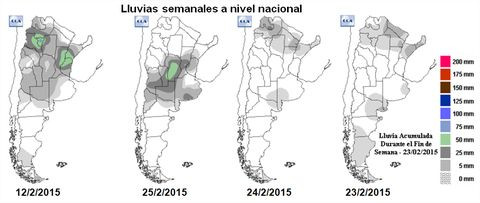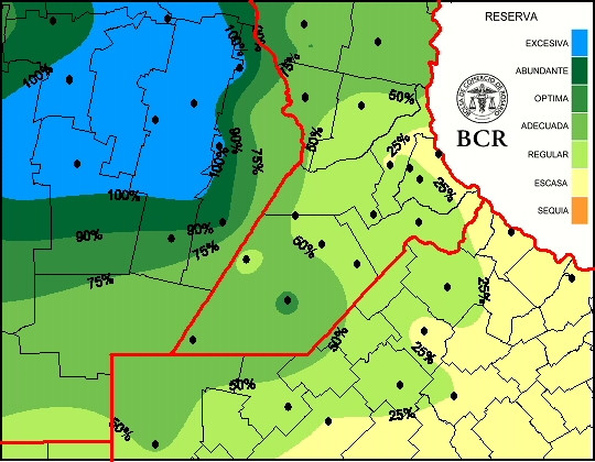 Las tormentas de febrero esquivaron al noroeste de Buenos Aires, zona donde tradicionalmente se concentran los mayores acumulados. Si bien enero recargó las reservas del perfil, hace varios días que no llueve en esta zona y los cultivos que están en el periodo crítico comienzan a sufrir. Esto pasa, especialmente, con el maíz de segunda y tardío que esta en floración y llenado de granos. Se espera ansiosamente que se cumplan los pronósticos de lluvias para hoy (26/2). El centro y sur de Santa Fe requieren recomponer la humedad superficial. Por último, el este cordobés presenta los perfiles completos de agua y excelentes condiciones de crecimiento para los cultivos. La imagen de reservas de agua muestra estos contrastes en la condición hídrica de la región.