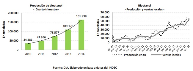 La producción nacional de etanol alcanzó 161.998 toneladas en el cuarto trimestre de 2014, experimentando un crecimiento del 48% respecto de igual período de 2013. Las ventas en el mercado interno llegaron a las 152.477 toneladas, incrementándose un 36% en relación al cuarto trimestre del año anterior.