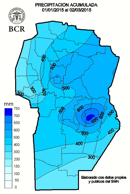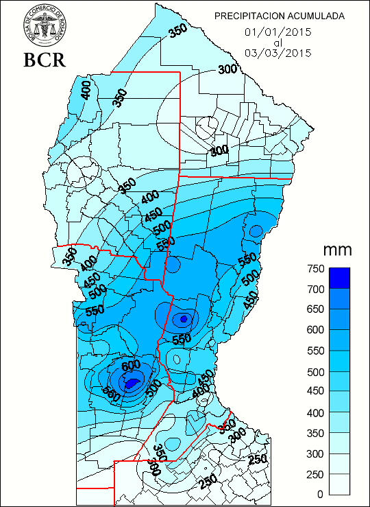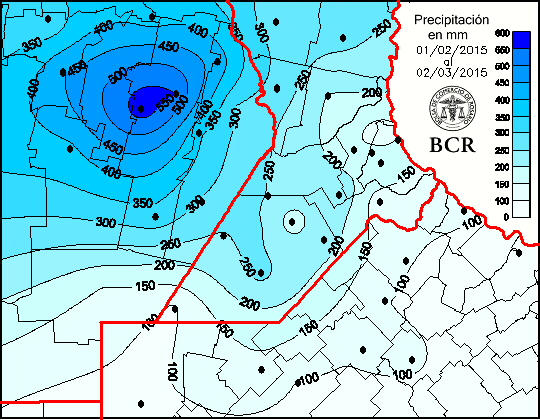 Hasta hoy (04/03/2015) destacamos los acumulados más significativos en el área oeste de nuestra región núcleo, ya sobre suelo cordobés. De acuerdo con el registro de nuestra red de estaciones meteorológicas, desde el 1° de febrero la localidad de Idiazabal recibió 720 mm. Le sigue Bellville con 701 mm, Hernando con 563 mm, Noetinger con 594 mm. Pozo del molle recibió 540 mm y Bengolea con 481 mm. En el mismo período, ya en el sur de Santa Fe, Classon acumuló 520 mm, Bigand 446 mm, Santa Teresa 430 mm y Rosario 400 mm.
