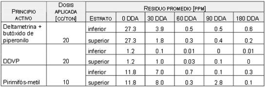 Del análisis de residuos de insecticidas encontrados en los granos, se desprende que, a pesar de haber tenido como objetivo, aplicar la dosis recomendada por marbete, la concentración de principio activo (p.a.) encontrada en el muestreo inicial, arroja valores superiores a los pretendidos: 27,3 y 11,8 ppm (Deltametrina y Pirimifos, respectivamente) e inferior: 1,2 ppm (DDVP) (Tabla 1).