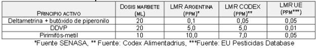 Tabla 2. Comparación entre la dosis de marbete y los LMR para Argentina, la UE y los establecidos por el Codex.