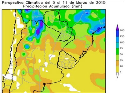 Al comienzo de la perspectiva, se completará el paso del frente de Pampero que hizo su entrada en los días precedentes, provocando precipitaciones sobre el norte y partes del oeste del área agrícola, mientras que la mayor parte del centro-este y el sudeste de su extensión recibirán valores escasos. Detrás del frente, arribarán los vientos del sector sur/sudeste, provocando un moderado descenso de la temperatura en el sur del área agrícola, mientras que el norte seguirá bajo la influencia de los vientos cálidos del norte. Los vientos del norte retornarán rápidamente haciendo subir la temperatura por encima de lo normal en la mayor parte del área agrícola, a excepción del litoral atlántico.
