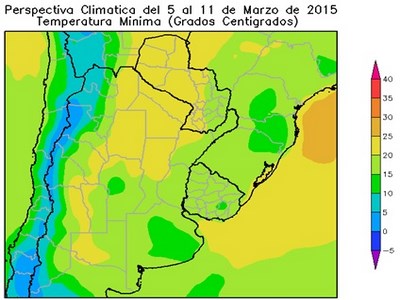 El centro del NOA, el centro y el este de Cuyo, la mayor parte de la Región Pampeana, la mayor parte de la Mesopotamia, la mayor parte del Uruguay y el sudeste del Paraguay, experimentarán temperaturas mínimas entre 15 y 20°C.El centro-oeste del NOA, el centro-oeste de Cuyo, el centro-oeste de Córdoba, las serranías de Buenos Aires y el centro-este del Uruguay, observarán temperaturas mínimas entre 10 y 15ºC.
