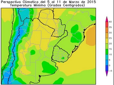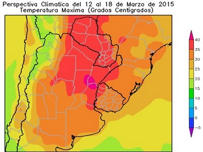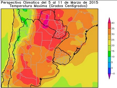 Los vientos del norte retornarán rápidamente haciendo subir la temperatura por encima de lo normal en la mayor parte del área agrícola, a excepción del litoral atlántico.La mayor parte del área agrícola registrará temperaturas máximas superiores a 30ºC. Observándose sobre el este de Salta, la Región del Chao, el norte de Santa Fe, la mayor parte de la Mesopotamia, el centro de Cuyo, la mayor parte de La Pampa, el sudoeste de Buenos Aires y la mayor parte del Paraguay, temperaturas superiores a 35°C, con focos con máximas de 40ºC.