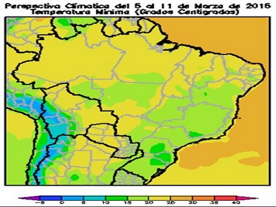 Al comienzo de la perspectiva, se producirá una breve irrupción de vientos del sur, que provocarán el descenso de la temperatura en las zonas altas de Santa Catarina, Paraná y Río Grande do Sul, pero el norte y el oeste del área agrícola brasileña, seguirá bajo la influencia de una masa de aire tropical. El norte del área agrícola, el oeste de Mato Grosso do Sul, el noroeste y el sur de Mato Grosso, el oeste de Goias y el este y el norte de Bahía, observará temperaturas mínimas superiores a 20°C.
