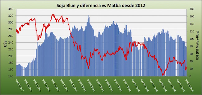 Por su parte, también resulta interesante analizar en términos absolutos la magnitud de esta distorsión (observando la brecha entre el valor blue y el precio de la posición inmediata en el Matba). Esto también se advierte en el gráfico que sigue, aunque expresado en barras azules sobre el eje derecho.