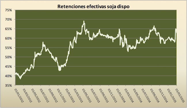 A partir de lo descripto la pregunta que debemos hacernos es qué nivel de retenciones efectivo enfrenta un productor de nuestro país en el mercado de soja, el cual es el único que funciona libremente sin las retenciones adicionales que enfrentan por ejemplo el maíz y el trigo (aunque en estos casos por restricciones en las exportaciones).