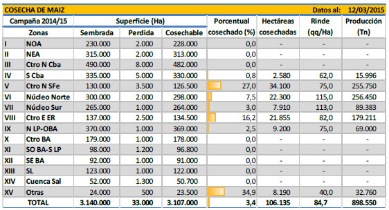 Frente a este escenario, sumado a lo descripto en informes anteriores, la proyección de producción de maíz destino grano comercial se mantiene en 22.500.000 toneladas, que de concretarse este volumen, estaría un -16,6 % por debajo de lo recolectado la pasada campaña (2013/14: 27 MTn).