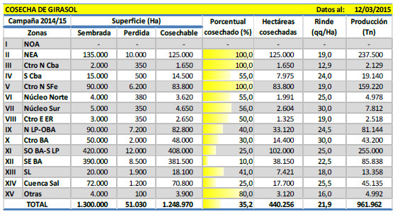 Durante la última semana continuaron las labores de trilla en el territorio nacional: las mismas se concentraron en la zona núcleo girasolera del Sudoeste de Buenos Aires-Sur de La Pampa, Sudeste de Buenos Aires y centro del área agrícola. A la fecha se lleva recolectado el 35,2 % del área apta, lo que representa en números absolutos unas 440.000 Ha, acumulando un volumen en chacra de 960 mil toneladas. El avance intersemanal se ubica en 10,6 puntos porcentuales, con un rinde promedio a nivel nacional de 21,9 qq/Ha, apuntalado por las productividades relevadas en las zonas del sur. Frente a este escenario, mantenemos la proyección de producción de esta oleaginosa en 2.600.000 toneladas para la campaña 2014/15.