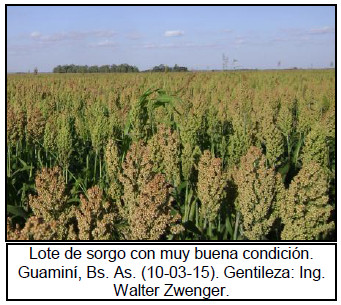 Las continuas precipitaciones sobre el Centro-Norte de Córdoba generan anegamientos en muchos lotes de sorgo granífero. Por tratarse de un cultivo que en general se destina a lotes bajos y de menor capacidad de uso, el problema se vería agravado. Al margen de esto, los cuadros de sorgo granífero hoy se encuentran llenando grano con muy buenas expectativas de rendimiento. El estado de esta zona es fundamental para la producción nacional, ya que concentra el 12 % de la superficie y el promedio de rinde de sus últimas cinco campañas es de 54 qq/Ha, una importante productividad entre las principales zonas sorgueras.