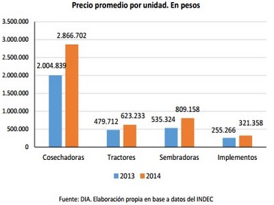 En lo que respecta al precio promedio por unidad, todos los rubros han mostrado fuertes incrementos frente al año 2013. El rubro sembradoras fue el que más subió, con un aumento del 51%, el rubro cosechadoras subió 43%, en tanto que los rubros tractores e implementos aumentaron 30% y 26% respectivamente.