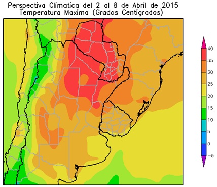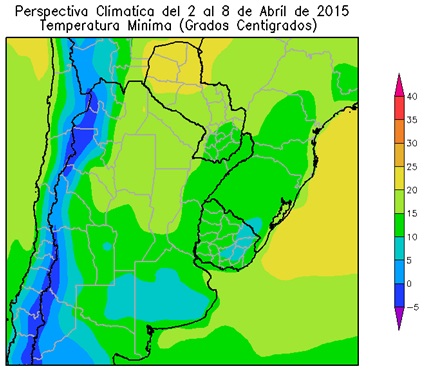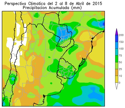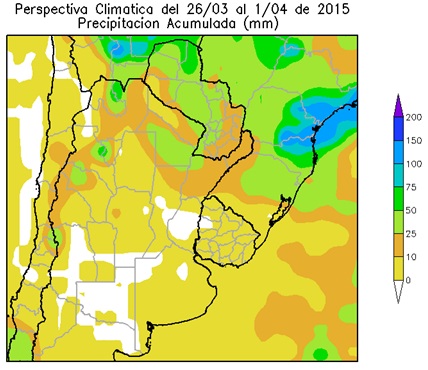 Al inicio de la primera etapa de la perspectiva predominarán los vientos del norte, provocando un incremento de la temperatura por encima de lo normal. Hacia el final de la primera etapa de la perspectiva, el paso de un frente provocará precipitaciones de variada intensidad sobre el norte del área agrícola, mientras la mayor parte del centro y el sur recibirán valores escasos. Junto con el frente se producirá la entrada de vientos del sur, debido a lo cual la temperatura experimentará un marcado descenso térmico. Según la información disponible a la fecha, la mayor parte de la Semana Santa (Domingo de Ramos a Sábado Santo) se desarrollaría en forma bastante tranquila, sin fenómenos meteorológicos notables. No obstante, se prevé que el Domingo de Pascua (5 de Abril) comenzarían a producirse precipitaciones abundantes que, eventualmente, podrían dar lugar al desarrollo de tormentas.