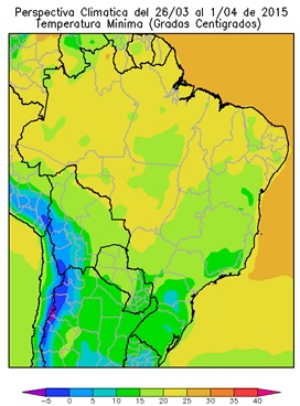 • El sur de los Estados de Pará, Tocantis, Piauí, el norte de Mato Grosso, la mayor parte de Mato Grosso, Bahía, Mina Gerais, Goias, Sao Paulo, el norte de Paraná y el este de Santa Catarina, observará temperaturas mínimas entre 15 y 20ºC.
