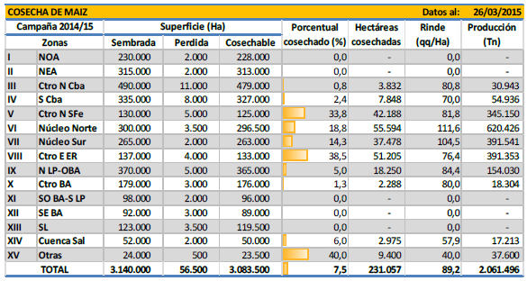 En las zonas del Centro de Buenos Aires, el Norte de la Pampa-Oeste de Buenos Aires y la Cuenca del Salado, continuaron las labores de recolección llegando a una superficie de 410.000 hectáreas cosechadas. Los rindes se mantienen por sobre los promedios históricos, producto de las excelentes condiciones registradas durante el ciclo del cultivo. Cabe mencionar de forma particular la situación registrada en la zona Norte de la Pampa-Oeste de Buenos Aires, en donde los rendimientos se ubican un 25 % sobre la media del último decenio, alcanzando a la fecha los 25,5 qq/Ha.