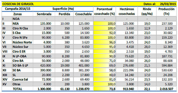 Las labores de trilla continúan en el territorio nacional; las mismas se concentran en las zonas del Sudoeste de Buenos Aires-Sur de La Pampa, en la Cuenca del Salado, el Sudeste y el Centro de Buenos Aires. A la fecha se lleva recolectado el 73,8 % de la superficie apta a nivel nacional, lo cual representa en números absolutos unas 900.000 hectáreas, acumulando un volumen en chacra de 2 MTn. El avance intersemanal se ubica en 13,5 puntos porcentuales, con un rinde promedio a nivel nacional de 22,1 qq/Ha. Los excelentes rindes recolectados en las zonas núcleo girasoleras del sur se afianzan a medida que avanzan las máquinas, elevando el rendimiento nacional; de esta manera, aumentamos la proyección de producción en 150.000 toneladas, llevando a 2.750.000 toneladas la proyección para la actual campaña 2014/15.