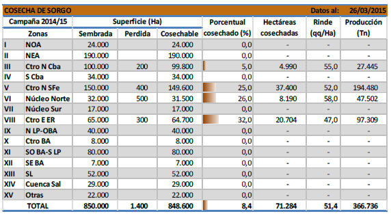 Avanza la recolección de sorgo granífero a nivel nacional, e inician sus labores de cosecha las zonas del Centro-Norte de Córdoba y el Núcleo Norte. Al presente informe se lleva recolectado el 8,4 % de la superficie apta, lo que en números absolutos representa 71.000 hectáreas. Los lotes trillados entregan un rinde medio de 51,4 qq/Ha, y el volumen acumulado en chacra asciende a las 367.000 Tn.