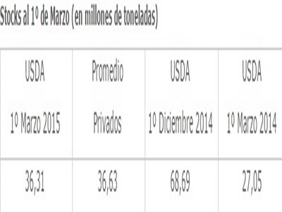 Las existencias vigentes al 1º de marzo fueron relevadas por el USDA en 36,31 millones de toneladas, un 34,23% por encima del volumen vigente un año atrás. En este caso, el dato oficial estuvo levemente por debajo de los 36,63 millones previstos por el mercado en la previa del informe. Si bien es cierto que el mercado ya viene reflejando en los precios las abundantes existencias, la diferencia entre el dato oficial y el esperado por el mercado no parece ser de una magnitud tal como para ser interpretada como alcista.