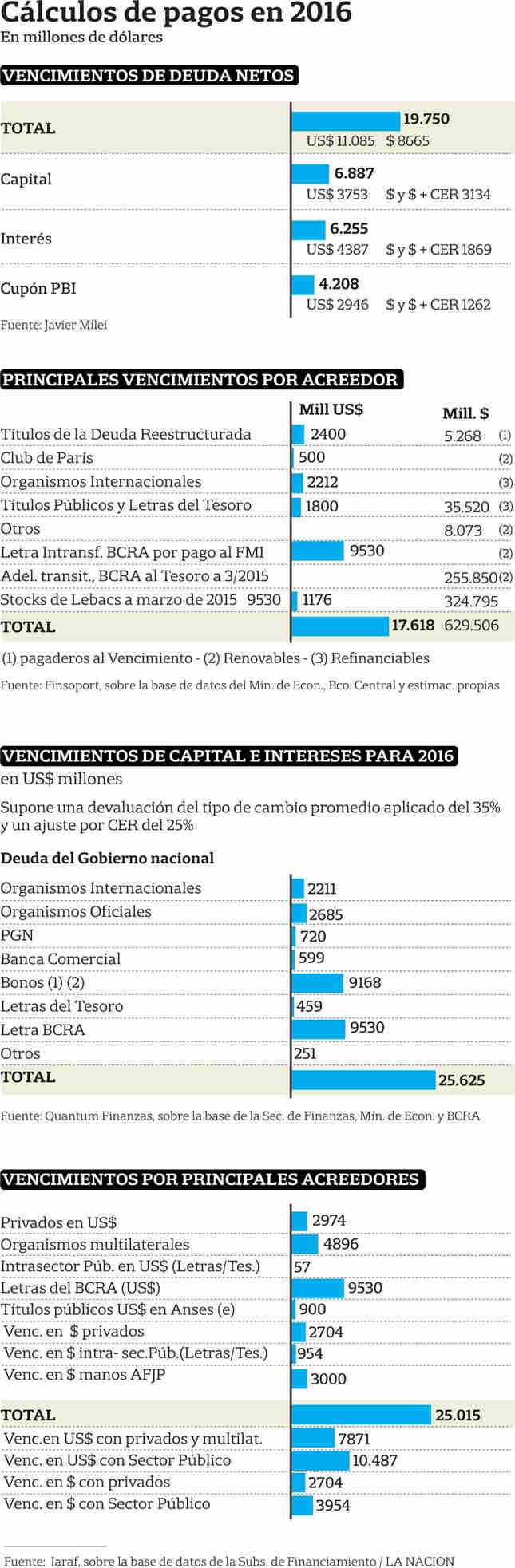 Daniel Marx, ex secretario de Finanzas y presidente de Quantum Finanzas, supone una devaluación durante 2015 del orden del 35% y un índice de ajuste CER para la deuda indexada en pesos del orden del 25%. La cuenta de vencimientos para 2016 le da, otra vez, 25.625 millones de dólares.