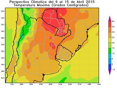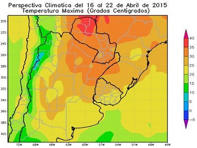 El norte del área agrícola, registrará temperaturas máximas superiores a 30ºC, observándose focos con temperaturas superiores a 35ºC, que se ubicarán sobre, la mayor parte de la Región del Chaco, el noroeste de Corrientes y la mayor parte del Paraguay. El centro del NOA; la mayor parte de Cuyo, la mayor parte de la Región Pampeana y la mayor parte del Uruguay, observará temperaturas máximas entre 25y 30ºC.