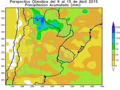 La perspectiva comenzará con vientos del sector sur, que provocarán temperaturas sobre lo normal en la mayor parte del área agrícola norteamericana. Paralelamente, se esperan precipitaciones abundantes sobre la mayor parte del Cinturón Maicero, mientras que la Región Sudeste observará valores moderados. Sólo el norte y el oeste del área triguera experimentarán valores escasos. Hacia el final de la perspectiva, se producirá la entrada de aire fresco procedente del noroeste, produciendo un marcado descenso de la temperatura, debajo de lo normal para la época.