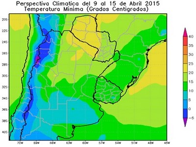 La mayor parte del Paraguay, el este de Salta y el norte de la Región del Chaco, registrarán mínimas superiores a 20ºC. El este del NOA, la mayor parte de la Región del Chaco, el noroeste de Corrientes, el norte de Córdoba, la mayor parte de Santa Fe, la mayor parte de Cuyo, la mayor parte de La Pampa y el sudeste del sudeste del Paraguay, observarán temperaturas mínimas entre 15 y 20ºC. El centro del NOA, el centro de Cuyo, la mayor parte de la Región Pampeana, la mayor parte de la Mesopotamia y la mayor parte del Uruguay, experimentarán temperaturas mínimas entre 10 y 15°C.