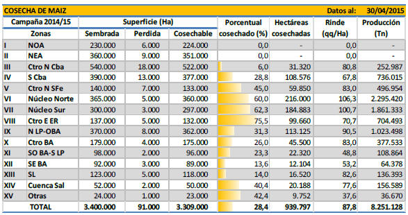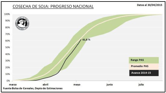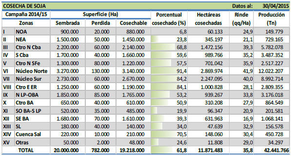 En consecuencia, al presente informe se estima que la superficie nacional implantada es de 20.000.000 de hectáreas, marcando un recorte de -2 % en comparación a la cifra sostenida hasta nuestro informe previo (estimación de área de soja al 23-Abr-2015: 20,4 MHa). Sobre esta estimación de superficie corregida, y teniendo en cuenta el rápido avance de cosecha y los elevados rendimientos sostenidos hasta la fecha, la proyección de producción al cierre del ciclo se eleva a 60.000.000 de toneladas (+2,6 % vs informe previo), cifra que representa un récord histórico en producción de esta oleaginosa en nuestro país.